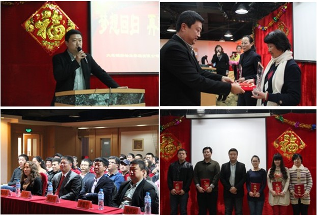 大连锦联物业管理有限公司“梦想回归•再攀高峰”主题年会于2013年1月11日15:30在恒源酒店召开,大连锦联物业管理有限公司及下属四家物业服务中心174名员工参加了本次会议,会议由管理公司行政人事部经理赵晶主持。本次会议首先对大连地区物业公司发展史及整合进程进行了展示,图文并茂的演示文件带领员工再一次回顾了公司历年走过的足迹,振奋人心;随后的表彰环节,通过颁发“先进部门”、“优秀员工”、“锦联风范奖”以及“卓越成就奖”,让员工领略到锦联浓郁的企业文化,良好的工作氛围,以及优越的发展平台,特别是“卓越成就奖”表彰,对在企业任职超过15年的员工齐丽萍和王丽进行了嘉奖,精心制作的员工风采展示文件将她们的事迹谱写成散文,记录她们在锦联的成长,扑捉了两位员工生活中和工作中不同的面貌,感谢他们对企业的付出和对锦联精神的传承,在场员工无不为他们的敬业和坚持所动容,两位员工眼含热泪地从总经理李建平手中接过奖杯,呈现出幸福企业大家庭的真实画面;接下来,管理公司财务部副经理邱少春做了全年工作汇报,对公司在2012年的经营状况做了客观、明确的总结与分析;最后,管理公司总经理李建平做了总结发言,李总对公司全体员工在2012年的工作业绩予以肯定,对2013年的工作提出了新思路、新想法、新要求,使员工对未来的工作充满了信心和力量。 18时整,迎新晚宴在各企业员工联合录制的“江南style”舞蹈视频中正式拉开帷幕,员工们多才多艺的表演让我们看到了锦联人多样的精神风貌,席间的趣味游戏及抽奖环节更是将晚会气氛推向高潮,员工在一片欢声笑语中,共迎新的一年。
