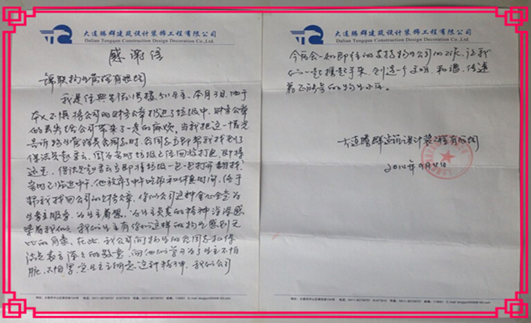 近日,锦联地产大连经典生活物业服务中心收到了来自1号楼511业主的感谢信。信中,业主诚挚赞扬了锦联物业员工不畏劳苦、尽心竭力的奉献和服务精神,对锦联物业的责任意识和服务品质给予了极高评价。 前几日,由于业主疏忽,不慎将单位财务印鉴掉落垃圾桶并同其他垃圾一同丢弃,如不能及时寻回,不仅会给业主带来大量实际的麻烦,还可能要面对诸多潜在的风险。当业主发现印鉴遗落情况时,本人又恰在外办事无法及时回到小区寻找,而一旦垃圾集中清运完毕,基本也就失去了寻回的可能。迫在眉睫之际,业主拨通了客服专员谷玉荣的电话。得知这一情况,谷玉荣立即联系保洁员赵秀云共同寻找财务印鉴。此时,已近午休时间,所有的垃圾也已经全部装袋整理完毕等待集中清运。得知业主的难题后,保洁员赵秀云二话不说,午饭也顾不上吃,将垃圾袋一袋一袋打开翻找。烈日当头,汗水模糊了视线,尽管并非分内工作,但她不仅没有怨言,还锲而不舍地认真搜检,最终找到了业主遗落的印鉴。 当锦联物业员工将财务印鉴交还业主手里时,失而复得的业主感激之情溢于言表。业主说:大热天面对着成堆的垃圾,想来即使是他本人也都会心生退却,没想到锦联物业的员工为了业主的利益不畏苦累。他为能够得到锦联这样的优质物业服务感到荣幸,并会一如既往地配合、支持物业工作。尽心竭力为业主服务是锦联物业的一贯追求,业主的认可将化作今后继续努力工作的动力,与业主共同携手创造文明、和谐的物业氛围。