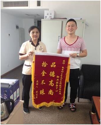 2015年9月9日中午,锦联国际大厦的一名来访人员刘先生带着“品德高尚,拾金不昧”的锦旗来到物业办公室,感激拾金不昧的保洁主管朱芸珊,刘先生亲手将锦旗送到朱芸珊手中,这不仅是对物业员工,也是对锦联物业的一份沉甸甸的感谢。
