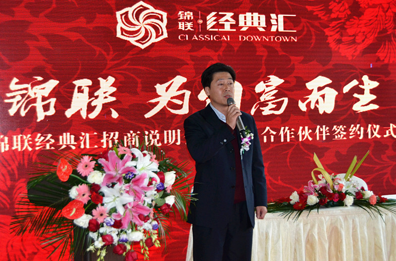 2015年11月05日,盘锦锦联·经典汇营销中心人声鼎沸,盛况空前。“为创富而生”招商大会暨战略合作签约仪式在盘锦首席纯独立商街——锦联·经典汇厚载推出。盘锦市兴隆台区人大主任王子信、区政协主席杨书芬、盘锦市服务业委主任徐洪峰、兴隆台区政府副区长黄薇薇、区委宣传部常务副部长郗成文等区职能部门及工商、民生、兴业、交通银行分行领导,中国抗衰老促进会、中国留学人才发展基金会领导,盘锦电视台等各大主流媒体与100余位各界精英领袖莅临现场,共襄盛举。 盛会伊始,锦联地产集团副总裁孙志勇致开幕辞,介绍锦联集团概况、项目商业规划以及未来发展目标。随后,入驻项目商家代表盘锦市餐饮协会会长、桃园新村餐饮管理有限公司董事长许长义,美丽世界音乐广场董事助理TOMY先生现场分享携手锦联共赢财富的合作感受,对项目定位、招商条件、公司支持等多方面给予了认可及称赞,并对项目日后发展给予了美好祝福。