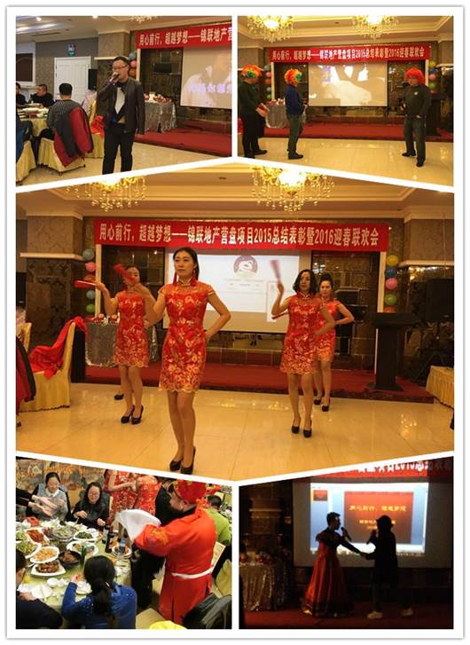 本次年会分为2015年度表彰、高管誓师及迎新联欢三部分。表彰大会上分别颁发了优秀员工、中层经理人及优秀部门奖项,肯定了员工们过去一年的努力,并希望他们能够持之以恒,相互勉励、精诚协作,秉持这份认真将这份荣誉传承下去。优秀员工代表纷纷发言,表达了对公司的热爱及对16年工作完成的坚实信心。 在随后的高管誓师诗朗诵中,项目全员一同回顾了营口锦联·经典名郡及盘锦经典汇项目从拆迁、动工到兴建落成、交付的发展历程,现场员工感同深受,斗志昂扬。营盘项目总经理吕冰总对项目2015年度工作进行总结讲话,他在肯定大家2015年工作表现后,希望大家在2016年继续高效执行,求真务实,团结合作、挖掘资源、实现全员营销。并提出对于2016年项目的“四季希望”:希望春天实现一季度开门红;夏天完成时间过半,任务过半;秋天收获累累硕果;冬天检视一年的收成,并代表公司向全体员工送上节日的问候和祝福。