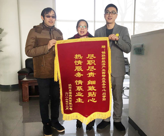 2016年12月30日,沈阳东深科技有限公司将一面印着“尽职尽责,细致贴心,热情服务,情系业主”的锦旗送到了锦联(沈阳)新经济产业园物业服务中心,表扬客服部员工闫学阳尽职尽责、热情服务业主的敬业精神。 沈阳东深科技有限公司于2016年9月9日入驻锦联(沈阳)新经济产业园二期U17楼。公司负责人表示,在企业入驻前期,物业工作人员的优质服务和热情态度就给大家留下了深刻的印象。在入驻后的近半年时间里,更深深体会到锦联物业服务的高水准、高品质。 锦联(沈阳)新经济产业园物业服务中心负责人张秀艳说:“在2016年最后一天得到业主的认可与赞誉,是给物业全员最好的新年礼物,同时也为2016年物业服务工作画上了一个圆满的句号。此时我们怀着收获的喜悦,更肩负着新的希望与责任,我们有信心、有责任在2017年将物业服务品质进一步提升,为锦联物业的长足发展奠定扎实的基础。”